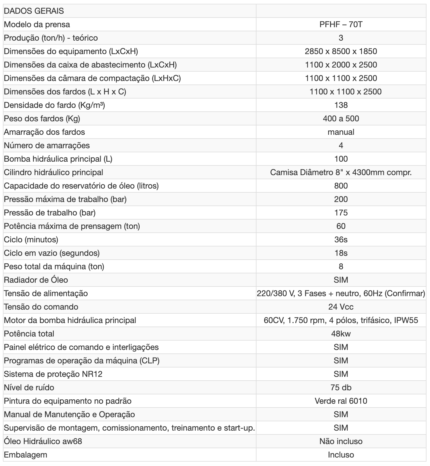 Ideal para enfardamento de PET, Algodão porem enfarda também papel, papelão, aparas, plásticos, bagaços de cana, rafia e outros. A alimentação poderá ser através de esteiras, diretamente na prensa, coifa ou ambas.